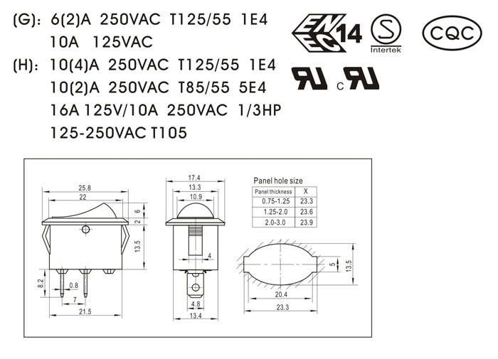 (G): 6(2)A 250VAC T125/55 1E4