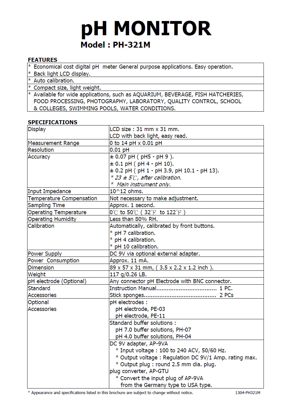 * Accuracy : 0.1 pH (pH 4 to pH 10).