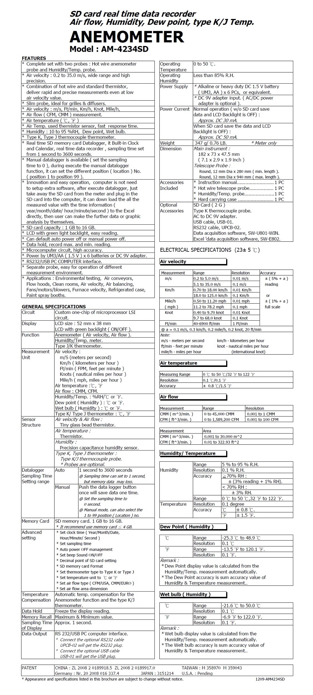 Product Name : HOT WIRE ANEMOMETER Model : AM-4234SD 記憶式熱風速, 濕度, 露點, 溫度計