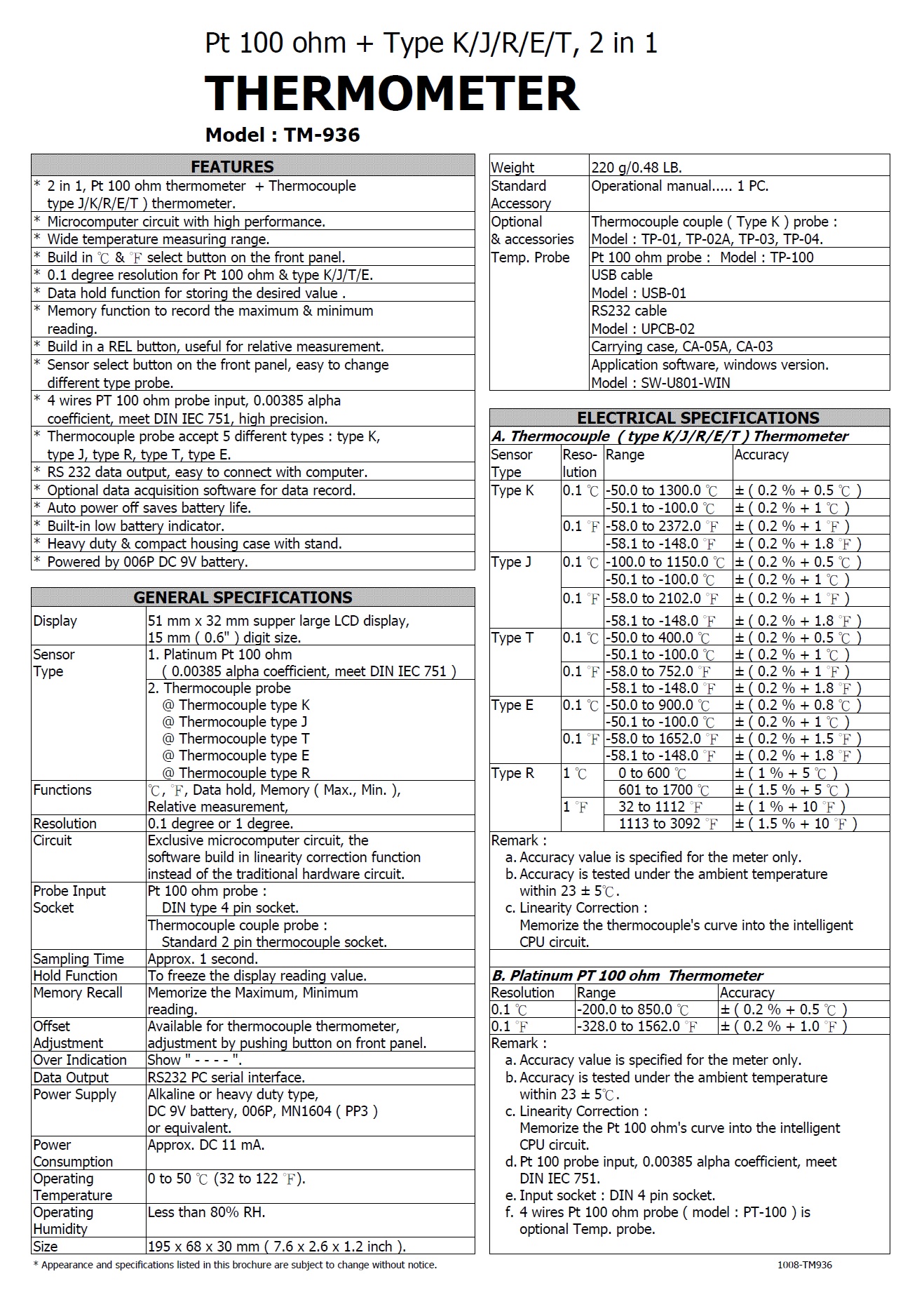* PT 100 ohm : -200 to 800 oC, max. 0.1 oC/ 0.1 oF.