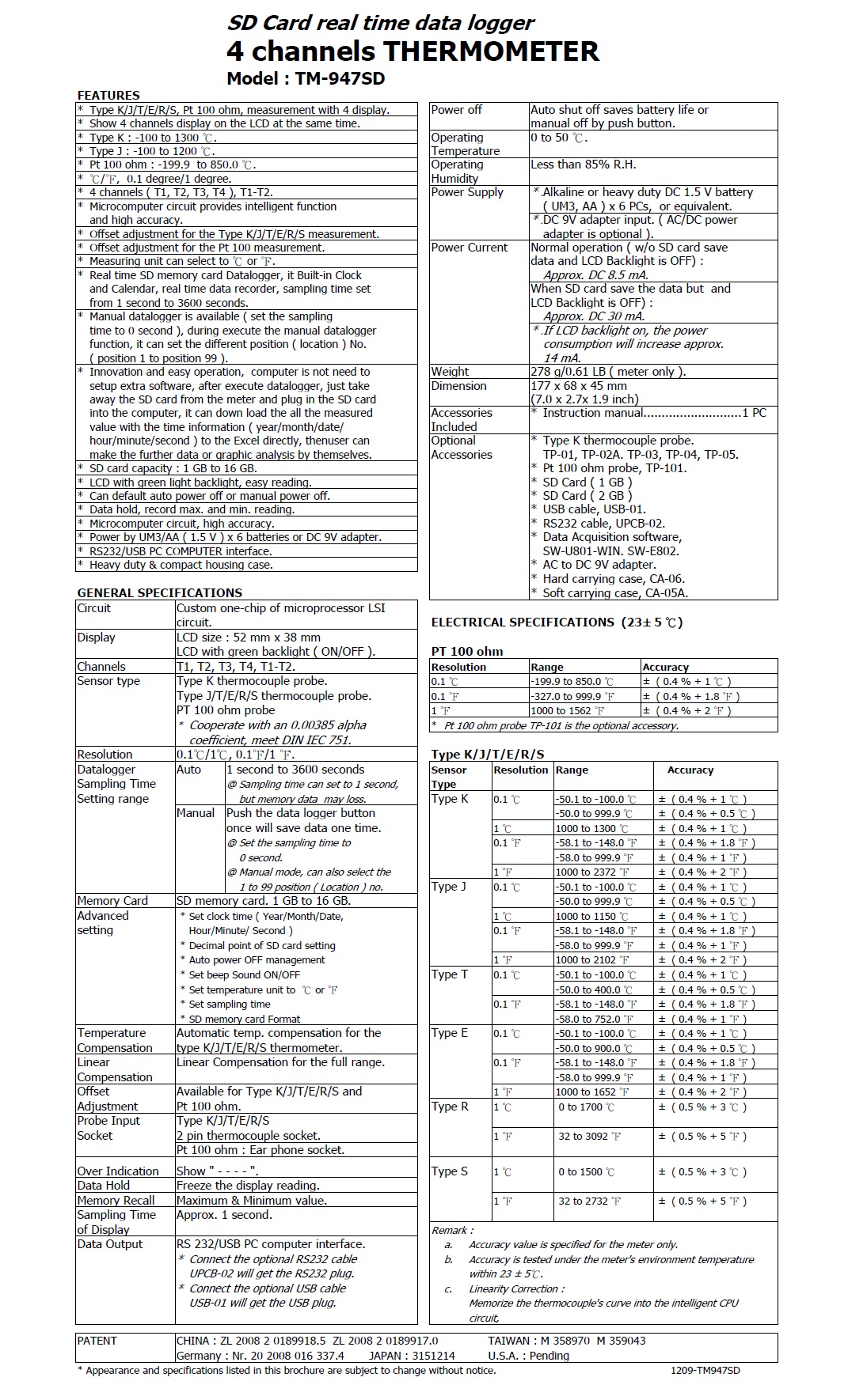 Model : TM-947SD    記憶式四通道溫度計