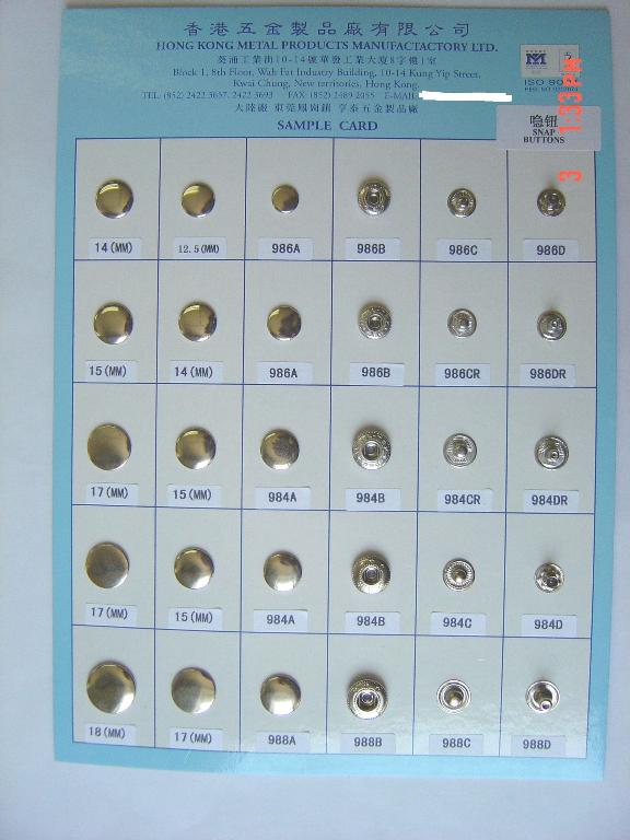 | Contact Details : | 香港五金製品廠有限公司 Hong Kong Metal Products Mfy. Ltd . . . . .東莞市駿雅鈕扣有限公司 Dong Guan Junya Matel Button Co., Ltd. | |