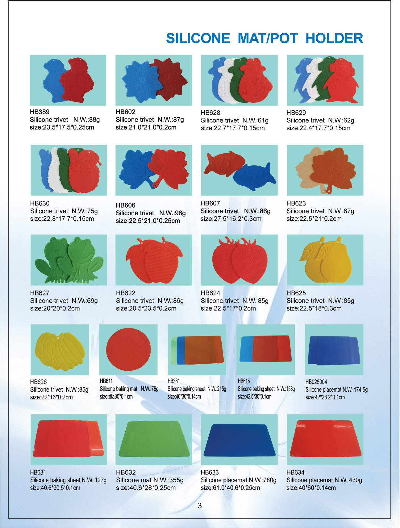 Our main products include silicone kitchenware, bakeware, baking moulds, muffin pan, pie pan, bundt pan, cake moulds, trivets, pot holders, gloves, brushes, kitchen scales, mats, coasters, cookie cutters, seals, tubes, spatulas, lid, keystrokes, grabbers, hot pads, colanders, turners, spoons, buckets, magnets, automobiles fittings, and other daily commodities.
